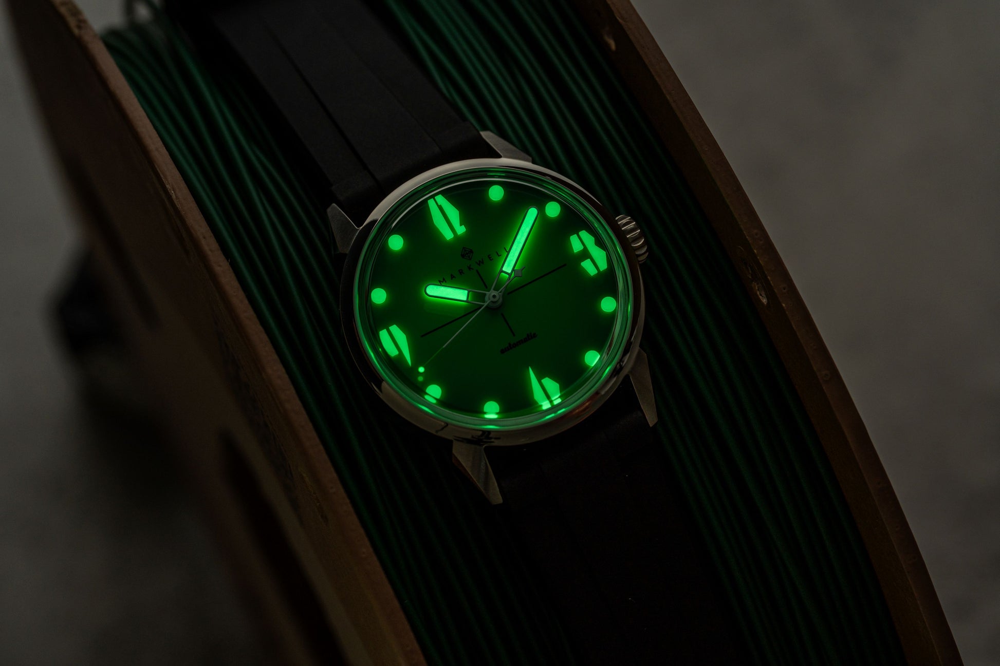 Luminescent Numerals, Markers, and hands.  Second hand colored tipped to match your dial.